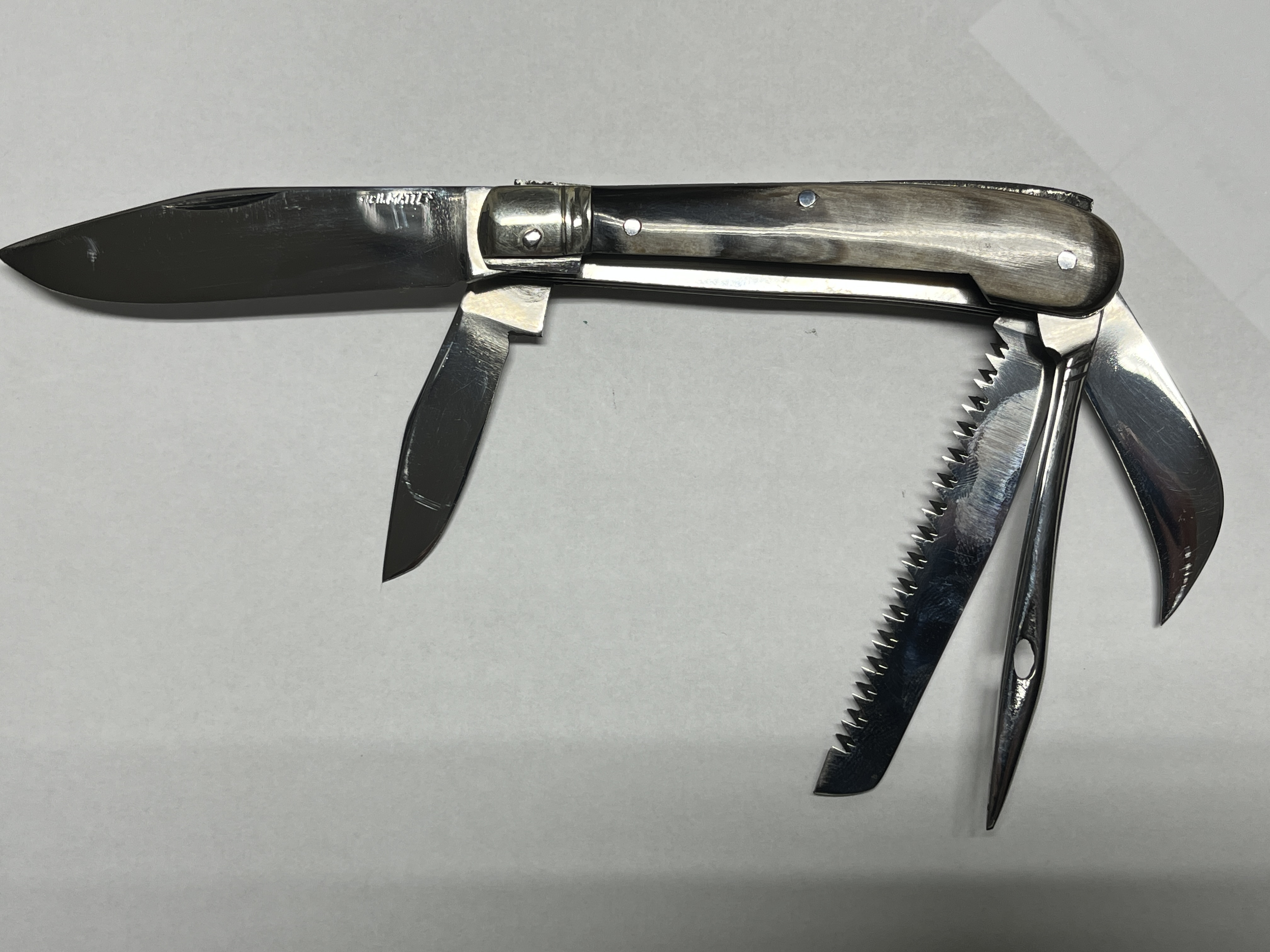 Dieses außergewöhnliche vierteilige Bauernmesser aus dem Hause R. Matthes ist ein echtes Highlight für Sammler und Liebhaber traditioneller Handwerkskunst. Gefertigt in den 1950er–1960er Jahren, steht es für eine Zeit, in der Werkzeuge noch für Generationen gemacht wurden.