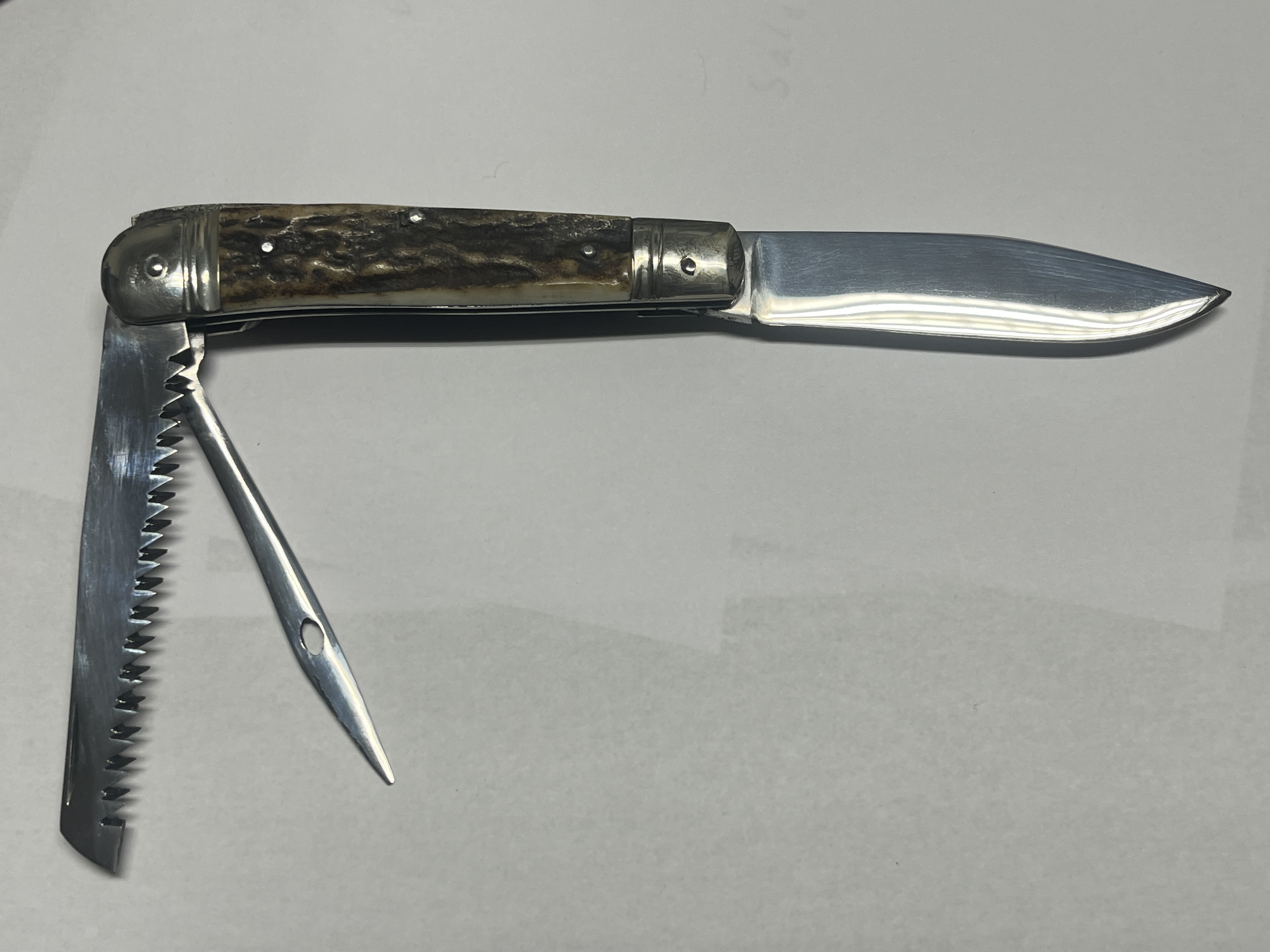 Klinge,Säge,Pfriem und Hirschhornbeschalung,Neusilberbacken.