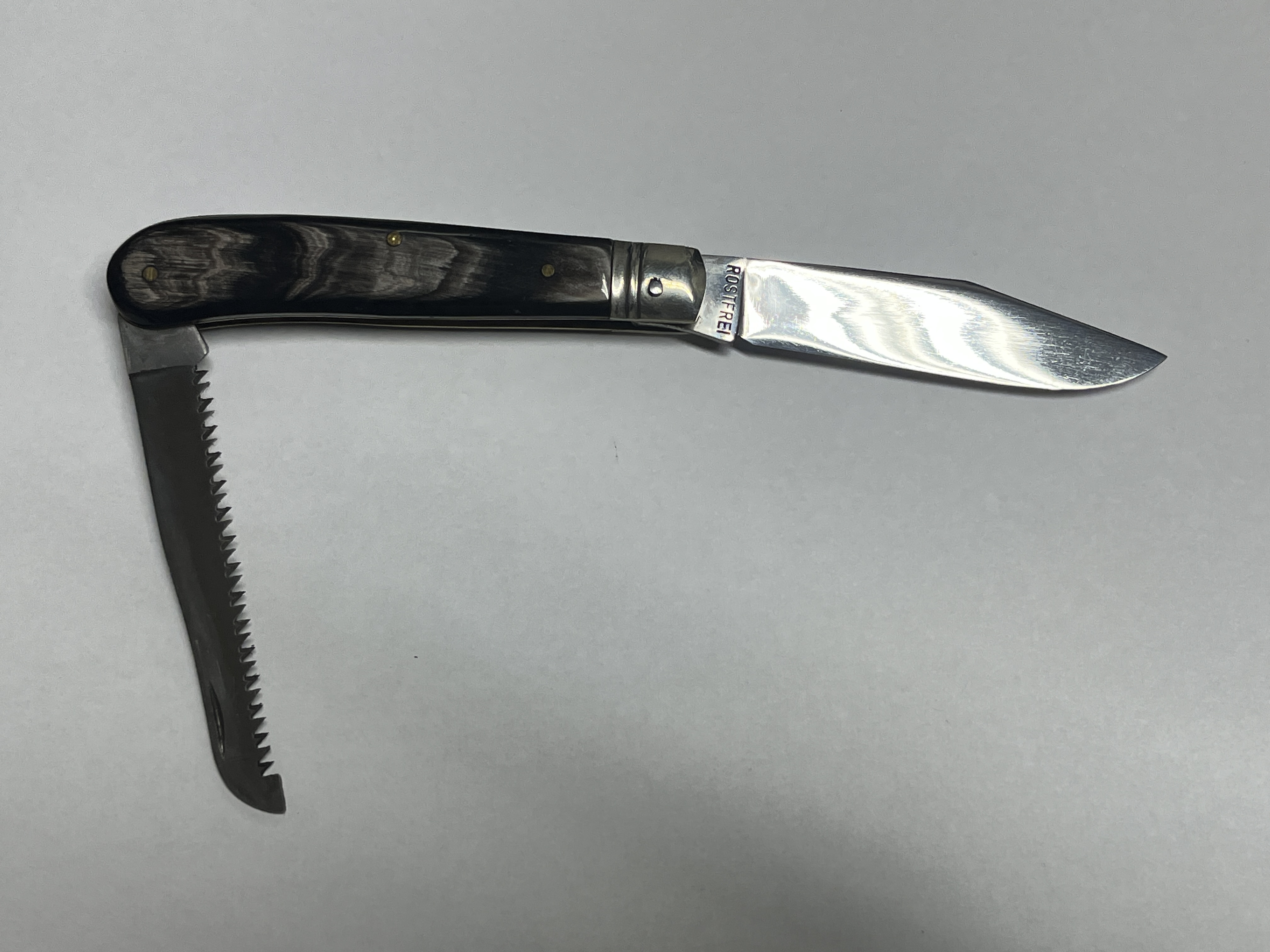 Dieses zweiteilige Bauernmesser von Gustav Branner, ausgestattet mit Klinge und integrierter Säge, ist ein echtes Highlight für jeden Messersammler und Liebhaber historischer Werkzeuge.