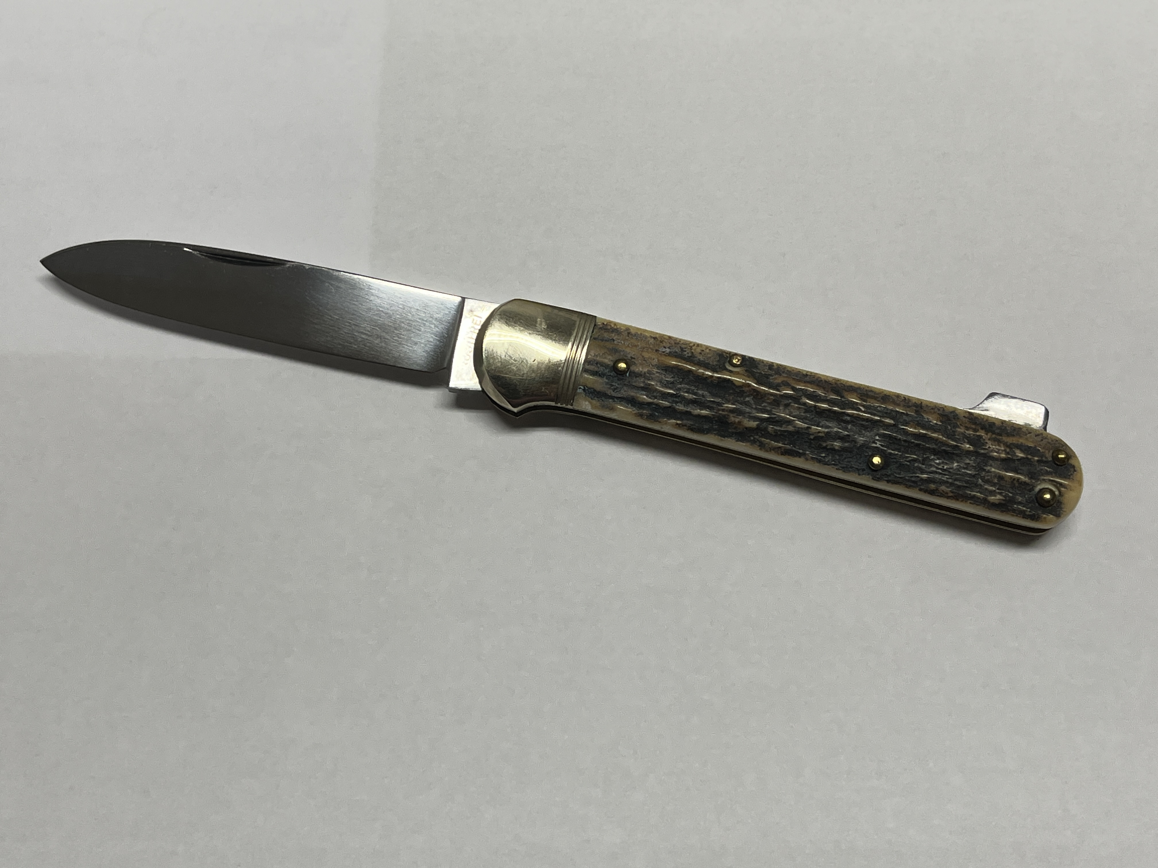 Aus einer Geschäftsauflösung.Jagdtaschenmesser 1 Klinge.Feststellbar ,Neusilber Backen.Ware hat Lagerspuren.