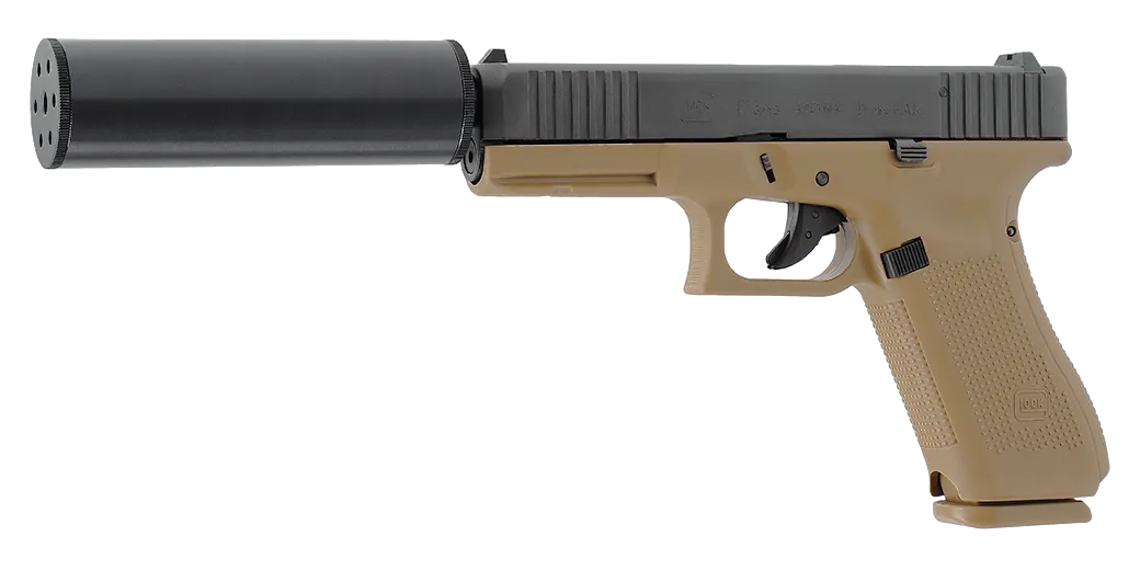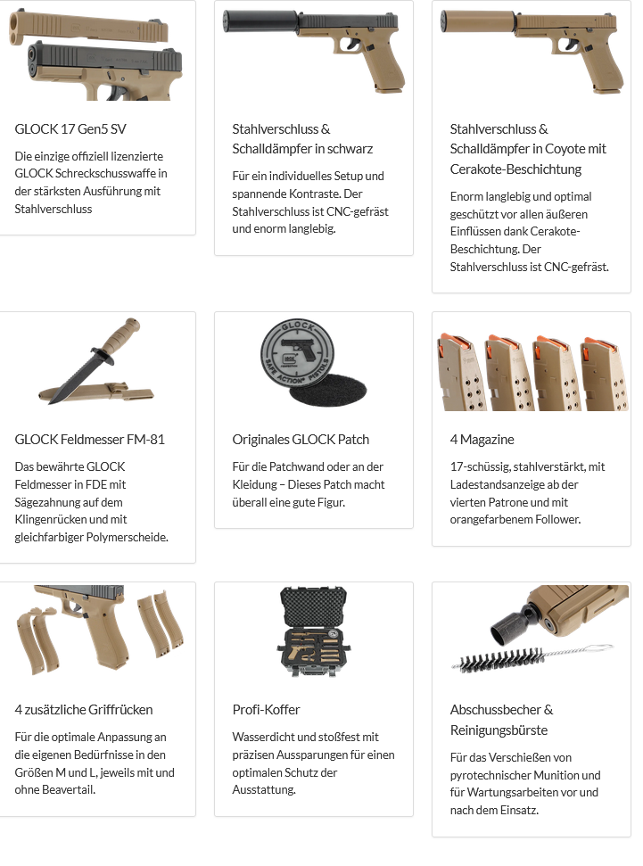 Das Herzstück dieses Premium-Sets bildet die GLOCK 17 Gen5 in Coyote – bei Auslieferung mit montiertem Stahlverschluss in schwarz. Für ein individuelles Setup mit unterschiedlichen Farbkombinationen liegt ein weiterer, mit hochwertiger Cerakote-Beschichtung versehener Stahlschlitten in Coyote bei. Farblich passend und ebenfalls frei kombinierbar befinden sich im Lieferumfang zwei Schalldämpfer – in Coyote ebenfalls mit Cerakote-Beschichtung. Insgesamt vier 17-schüssige Magazine in Coyote mit orangefarbenem Follower und vier GLOCK-Griffrücken (M+L, mit/ohne Beavertail) runden das Schreckschuss-Zubehör ab.