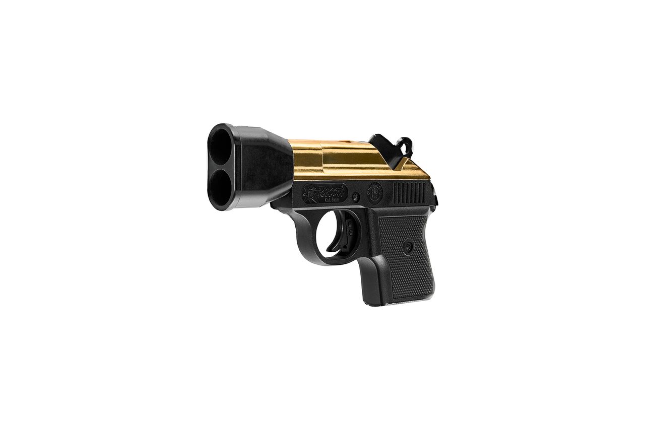 2-Schüssige Startpistole im Kaliber 6mm Flobert. Der Abschussbecher für zwei Raketen ist bereits fest montiert.