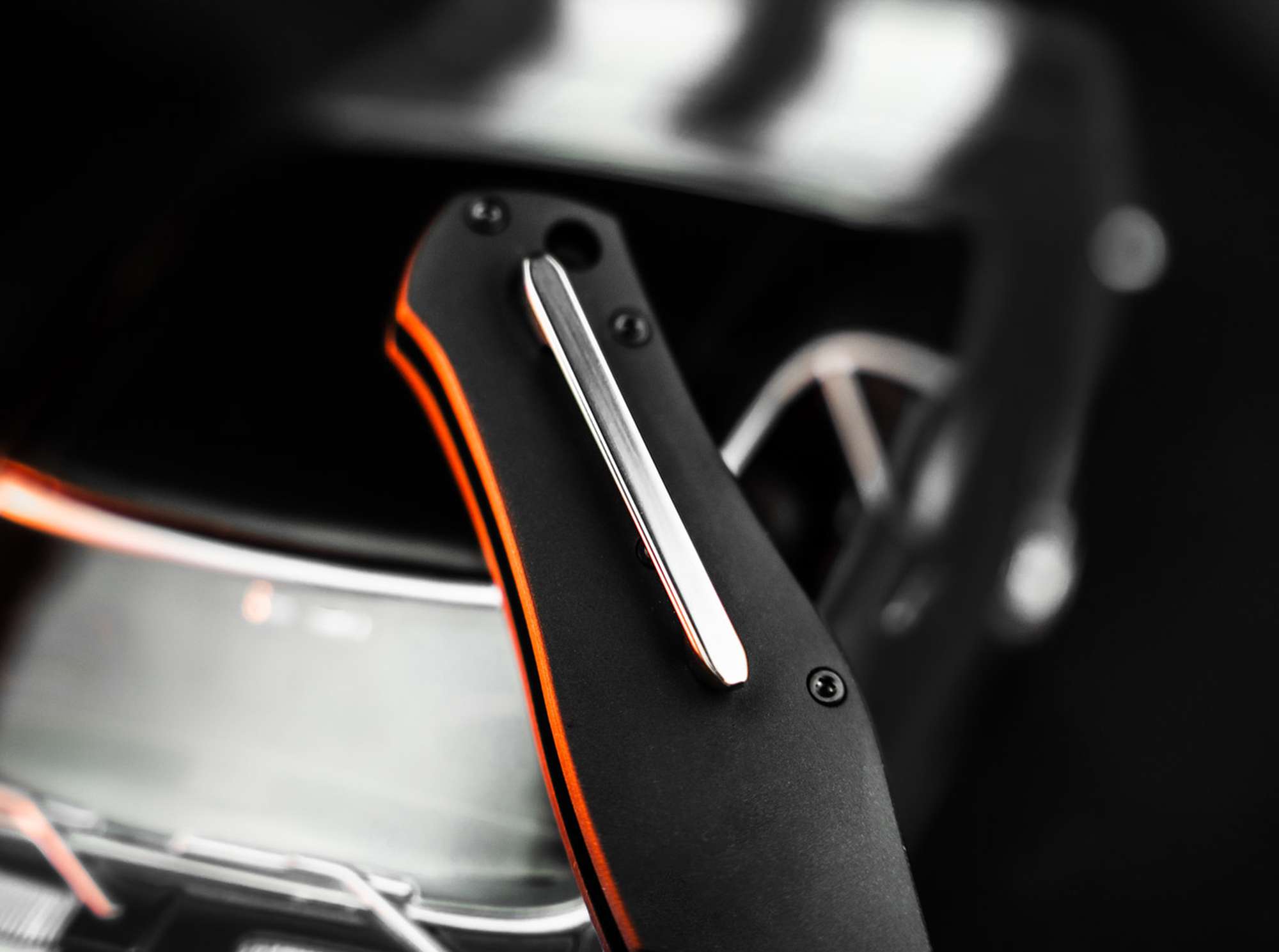 Der schwarze, hart anodisierte Aluminiumgriff interpretiert die Linienführung der Karosserie in progressiver Weise und wartet mit spannenden Details auf: Stufenheck, kleiner Heckspoiler und kiemenartige Lufteinlässe an den hinteren Kotflügeln wurden formschön in das Sammler-Messer integriert. Die Klingenachsschraube ist den bei Muscle Cars häufig verwendeten Felgen nachempfunden, wohingegen der geradlinige, aus dem Vollen gefräste Edelstahlclip an die verchromten Türgriffe erinnert.