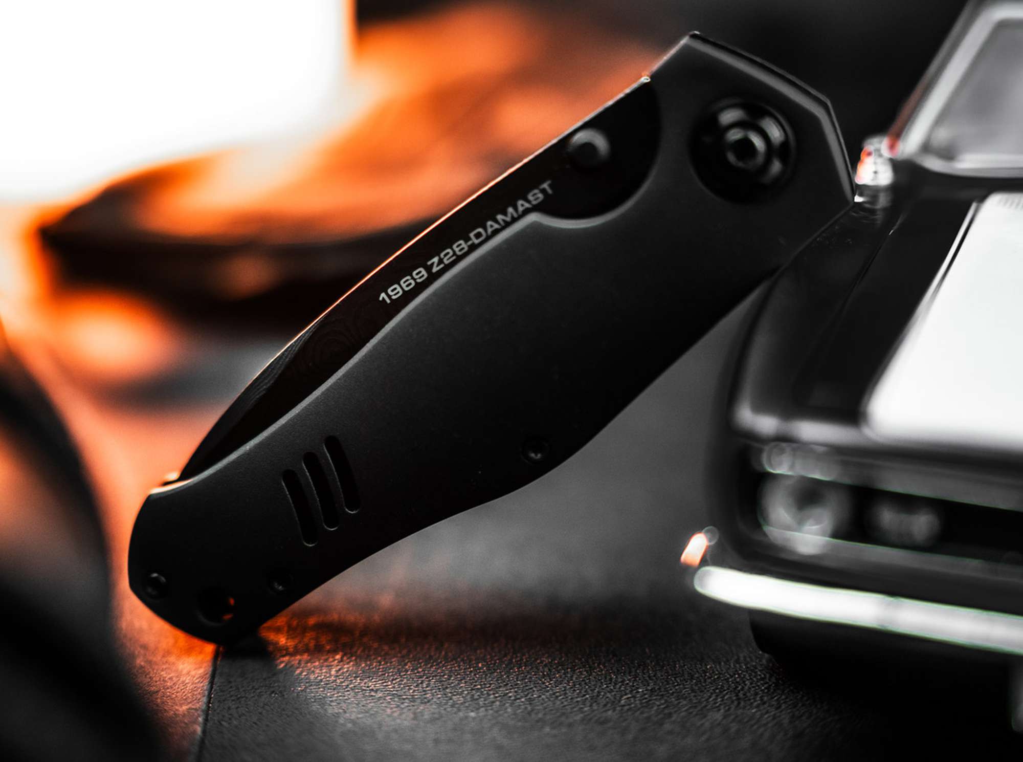In Zusammenarbeit mit dem italienischen Designer Tommaso Rumici entstand ein einzigartiges "Muscle-Knife", das die markanten Charaktereigenschaften des Camaro Z28 in Form und Stärke vereint. Die kugelgelagerte Drop-Point-Klinge aus 80-lagigem Damaststahl (58 HRC ±1), versehen mit einem edlen PVD-Finish, wurde von Chad Nichols im Muster "Tread" handgeschmiedet und erinnert an die abfallende Cowl-Induction-Motorhaube des Muscle Cars. Teile des oberen Querlenkers des Camaro wurden für die Klinge verwendet, die laufruhig mit dem Daumenpin öffnet, während der bissige Edelstahl-Liner-Lock das Messer zuverlässig arretiert.