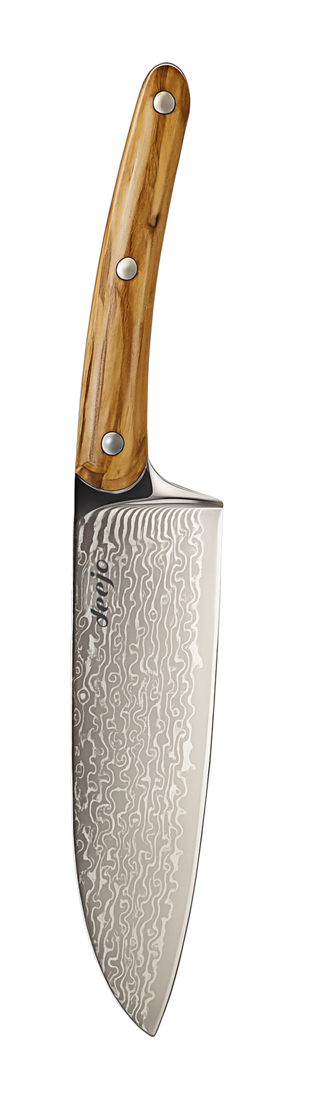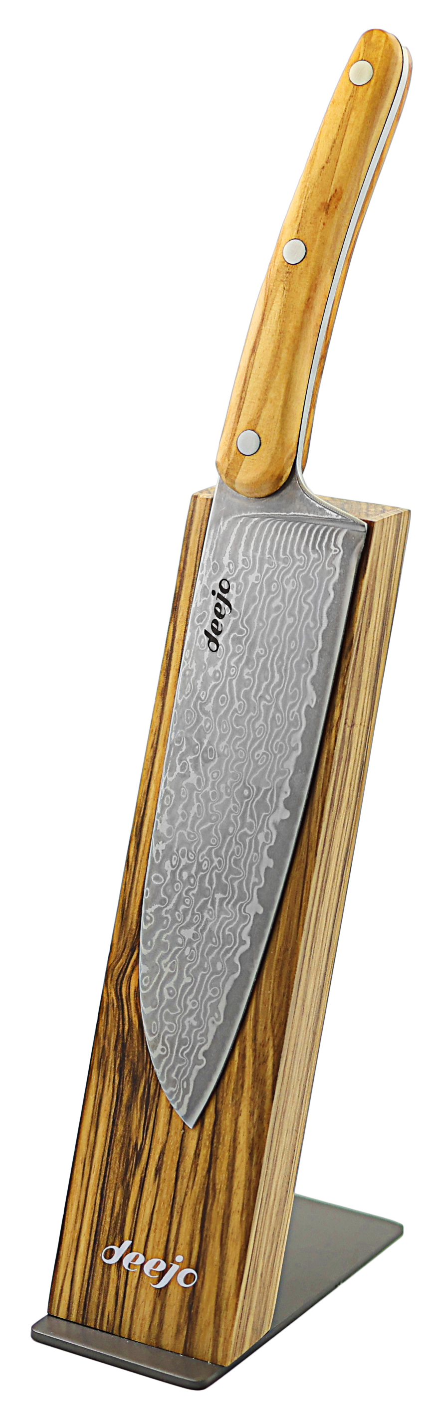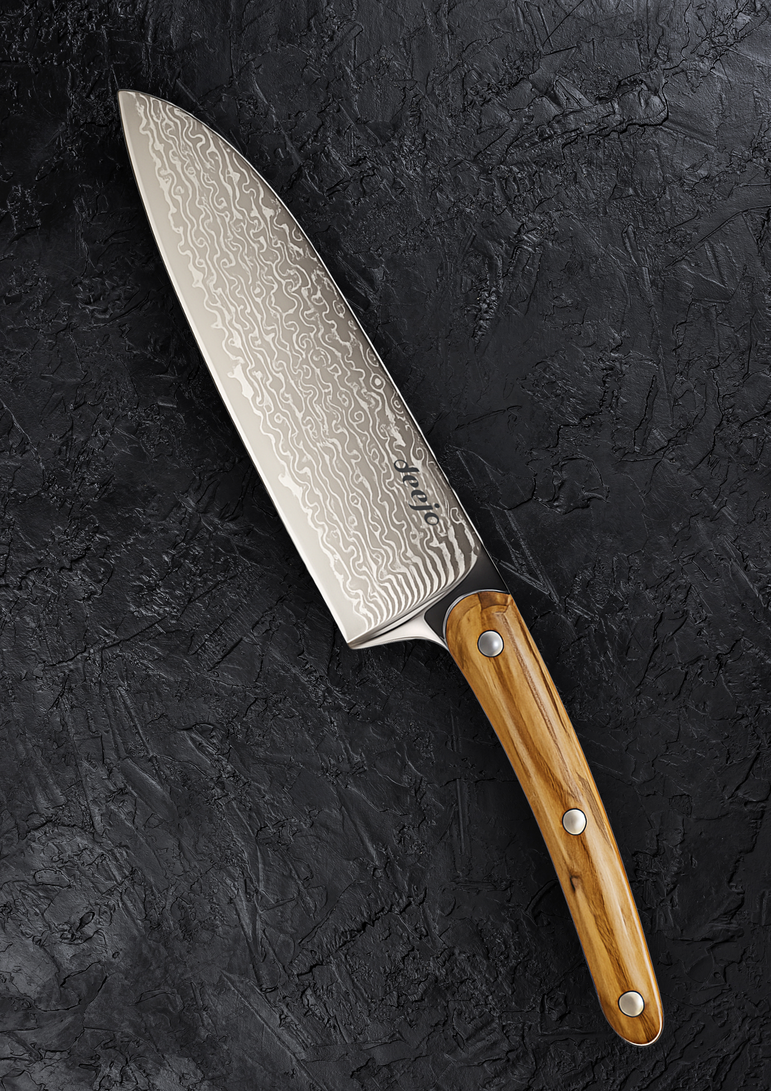 Santoku Messer aus rostfreiem Damaststahl mit 67 Lagen 304 / 3CR13 um einen Kern aus 9CR18. Limitierte, nummerierte Auflage von 2050 Stück (davon 25 nicht im Handel erhältlich). Griff aus Olivenholz. Lieferung in einer Prestige-Box mit einem magnetischen Ständer aus Zebranoholz.